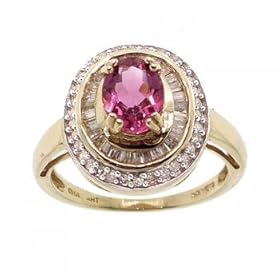 Get noticed with this appetizing oval cut Pink Tourmaline Diamond 14K yellow gold ring. This gold ring has a Pink Tourmaline gemstone. The Pink Tourmaline is oval cut. There is a full carat of Pink Tourmaline on this gold ring. There is also 60 Diamonds on this Pink Tourmaline ring. Thirty-two of the Diamonds are round-brilliant cut. The other 28 Diamonds on this Pink Tourmaline ring are tapered baguette cut. Together, there is a half carat of Diamonds on this Pink Tourmaline ring. This Pink Tourmaline Diamond ring is made of 14K yellow gold. Fourteen karat gold is the most popular out of all the other gold types. The 14K yellow gold has a high polish finish, which gives this Pink Tourmaline Diamond ring an incredible shine. Light dances off this delectable oval cut Pink Tourmaline Diamond 14K yellow gold ring!