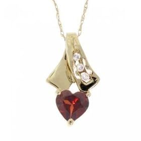 Bask in the color of this head-turning garnet and diamond 10K yellow gold pendant necklace. This pendant necklace is made of 10K yellow gold and has a heart cut garnet gemstone. There are also three diamonds. Each diamond is round-brilliant cut. You be noticed while wearing this wonderful garnet and diamond 10K yellow gold pendant necklace.