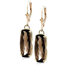 Dark, mysterious smokey quartz stones shine in 10 karat yellow gold in these alluring earrings. The elongated, cushion-shaped stones have a rich gray and golden brown hue and a beautiful faceted cut. They dangle from decorative curved posts that fasten with simple leverback closures. Smokey quartz is a durable gemstone that holds up well to everyday wear.